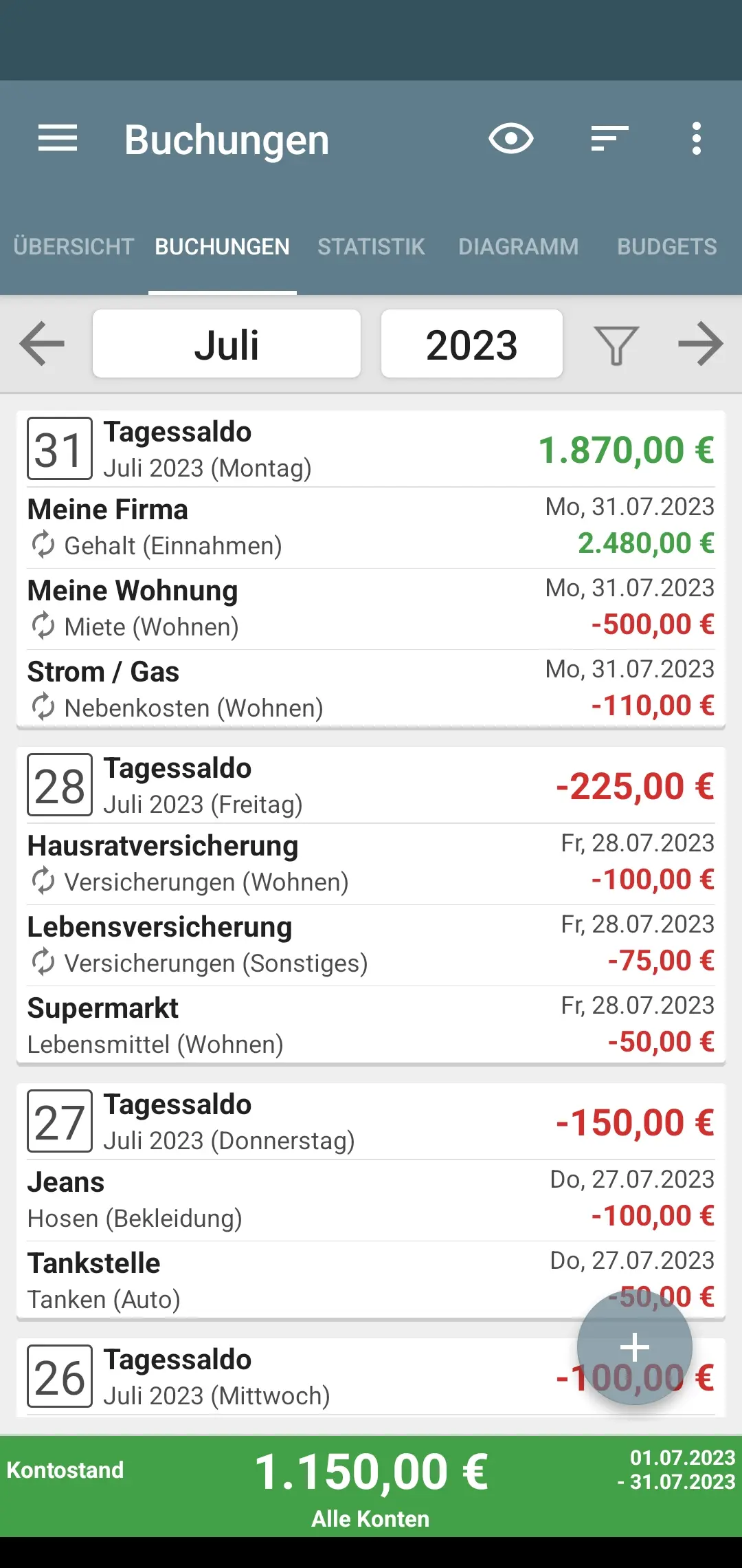 Möglichkeit, wiederkehrende Ausgaben (z. B. Miete) einzutragen.